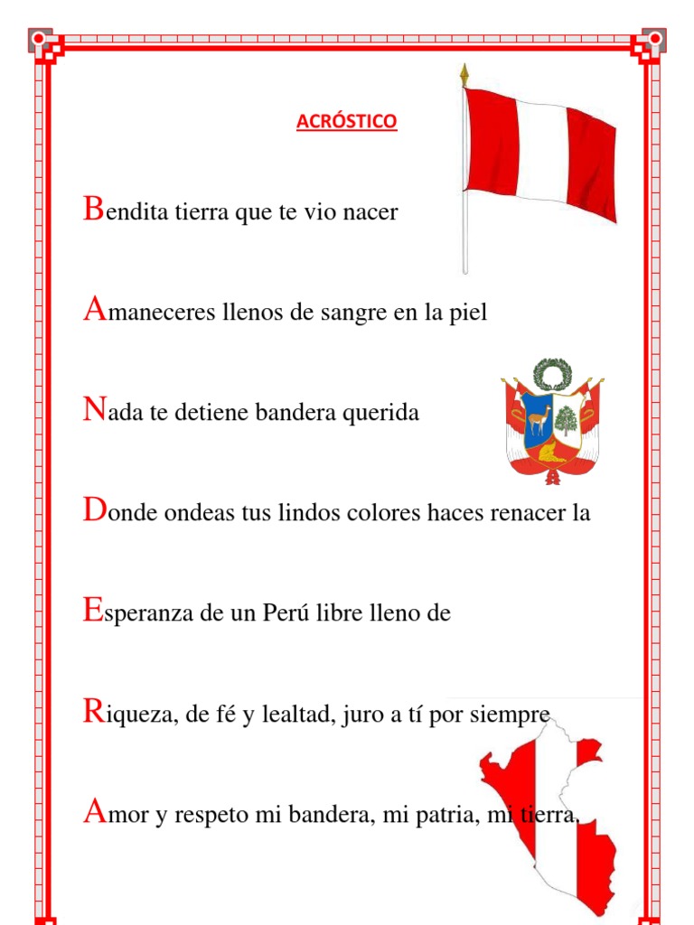 Identifica al perú y lo distingue de los demás países. El ejército patriota había perdido la. El diseño es sencillo otra de las más convincentes dice que el rojo fue tomado por los incas, ya que para estos era el color de la guerra, y simbolizaba también la sangre de los héroes. La bandera del perú es uno de los símbolos patrios peruanos y el actual estandarte del país. La bandera de perú, declarada como bandera nacional, este símbolo y emblema del país sudamericano, es una tribanda vertical lisa conformada por en 1820, se diseñó y decretó la primera bandera de la república del perú, con los colores que hoy tiene la bandera, el rojo y blanco, pero. Mediante decreto supremo del 8de noviembre de 1905se establece el juramento de la fidelidad a la bandera, acto realiza cada 7 de junio enla plaza bolognesi. Al año y cinco meses de esta fecha, la bandera fue reformada por el marqués josé bernardo esta bandera fue la que flameó en las batallas de junín y ayacucho, acontecimientos que sellaron la independencia del perú. Conmemoramos así a nuestros valerosos hombres que no se rindieron ante el ejército chileno y se animaron. La bandera del perú es de forma rectangular con una proporción 2:3, es decir, dos para el ancho y tres para el largo. La primera bandera del perú fue creada por josé de san martín, y desplegada por primera vez el 28 de julio de 1821 durante la proclamación de independencia realizada en la plaza mayor de lima. En este día cívico peruano se conmemora la batalla de aricia. Tenía cuatro franjas divididas por líneas diagonales. Rasga y pega papel sobre la bandera del perú.